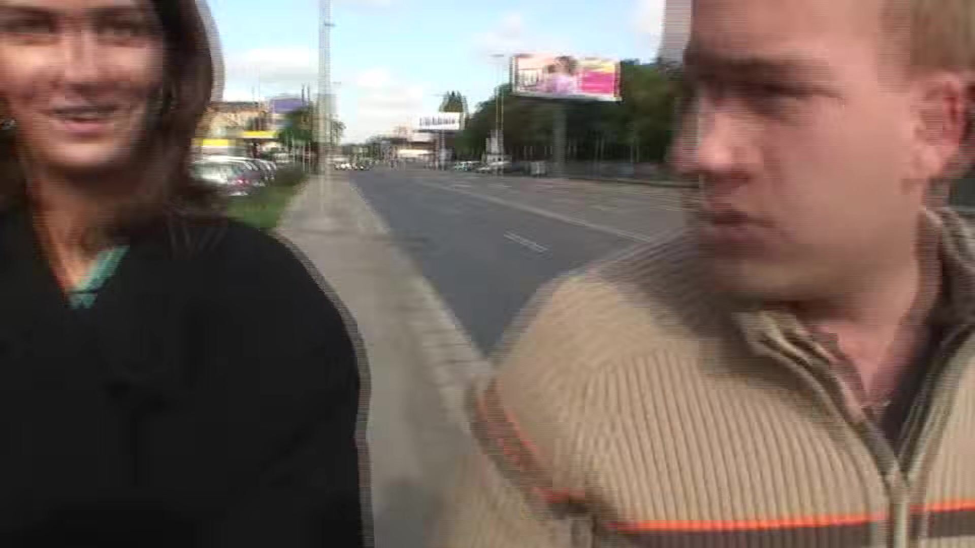 Public threesome with teen brunette