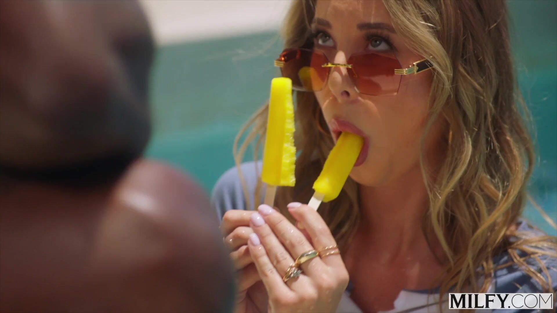 April Olsen takes two black cocks by the pool and begs for more