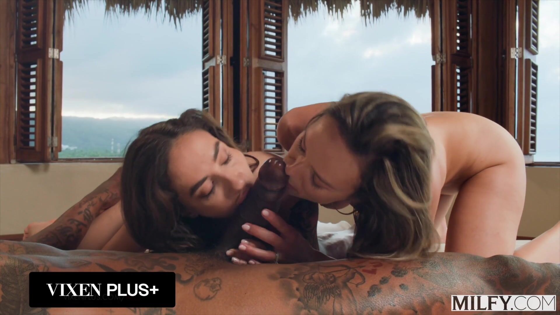 Threesome with two hot busty MILF